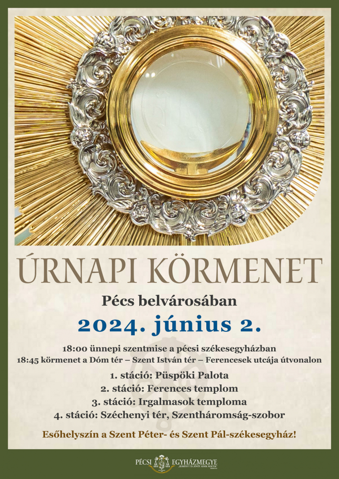 Az Oltáriszentségben velünk lévő Krisztust ünnepli a Katolikus Egyház úrnapján. Az ünnep alkalmából június 2-án, 18 órakor Felföldi László pécsi megyéspüspök celebrál szentmisét a pécsi székesegyházban, majd a liturgiát követően körmenetben kísérik az Oltáriszentséget a székesegyházból a Dóm tér, Szent István tér, Ferencesek temploma és az Irgalmasok temploma érintésével a Széchenyi téri Szentháromság-szoborhoz.