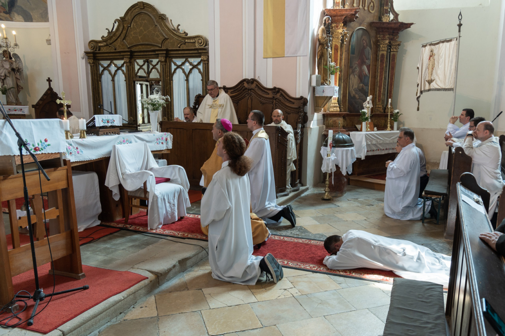 A szentbeszéd után a szentelési szertartásban az ünnepélyes ígérettételt követően a szentelendő arcra borulva, míg a hívek térdelve énekelték a mindenszentek litániáját, amit a felszentelés szertartása követett, melyben a püspök kézrátétellel adta tovább a jelöltnek az apostoloktól kapott lelki hatalmat.