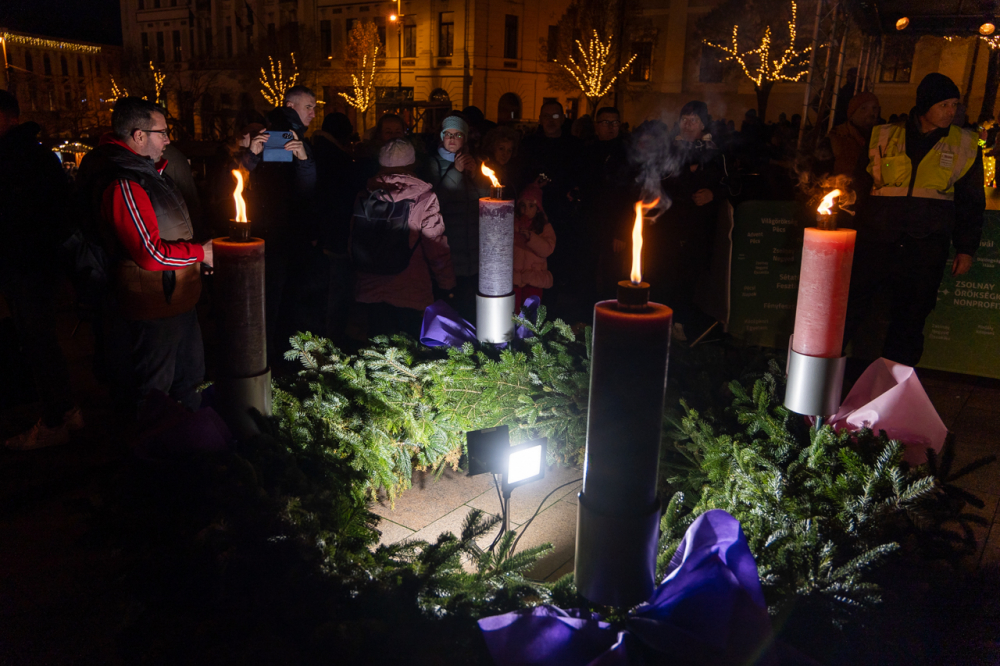 Advent 4. vasárnapjának előestéjén, december 21-én Felföldi László pécsi megyéspüspök a betlehemi lánggal gyújtotta meg Pécs város adventi koszorúján a negyedik, a szeretetet jelképező gyertyát.