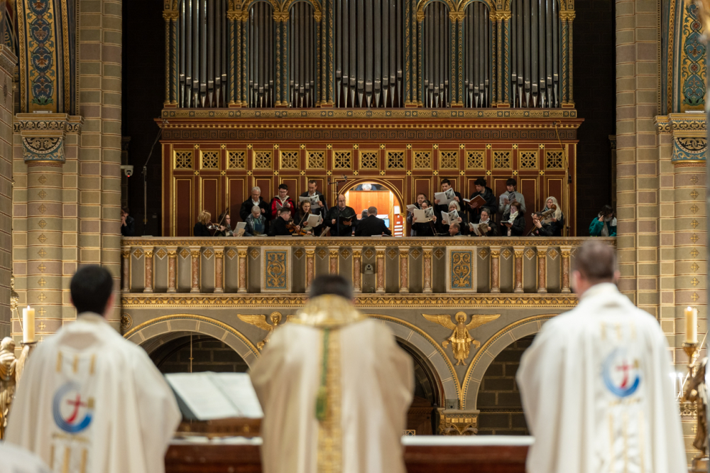 Az ünnepi szentmise zenei szolgálatában közreműködött a Pécsi Bazilika Mozart Kórusa és Zenekara, művészeti vezető: Kuti Ágnes, vezényelt: Békési-Marton Csaba. Az orgonán Kovács Szilárd Ferenc, a bazilika orgonaművész-zeneigazgatója játékát hallhattuk. A liturgiát a Magyar Katolikus Rádió és a Kossuth Rádió élőben közvetítette.