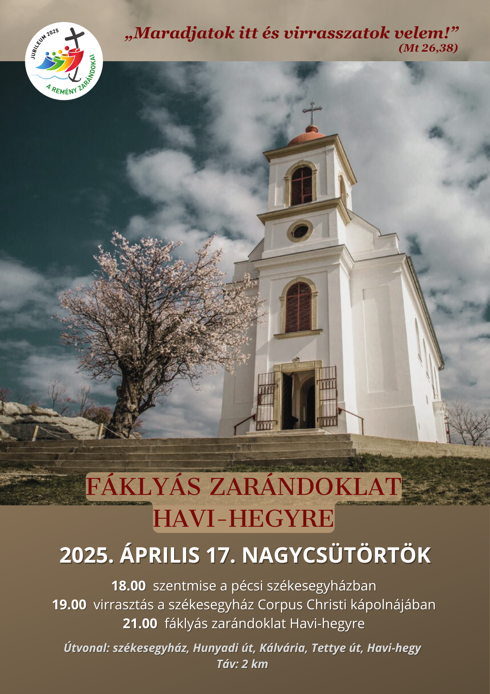Az utolsó vacsora után Jézus felment tanítványaival az Olajfák hegyére és a Getszemáni kertben virrasztott: a nagycsütörtöki pécsi fáklyás zarándoklat ezt a jézusi utat idézi meg. A hagyományoknak megfelelően a Havas Boldogasszony-templom előtti keresztnél egy tanúságtétel is elhangzik majd.