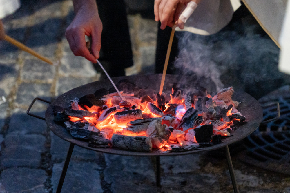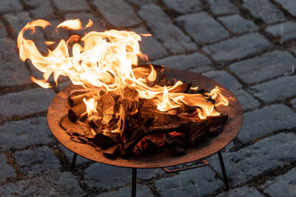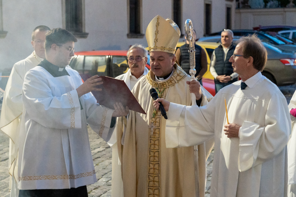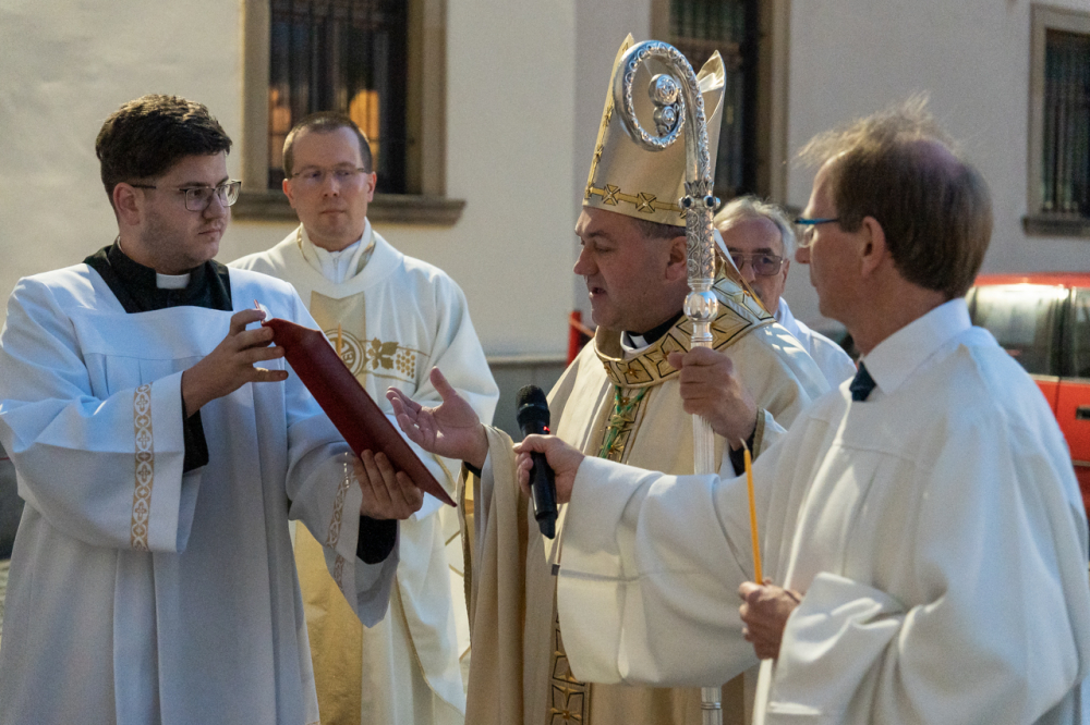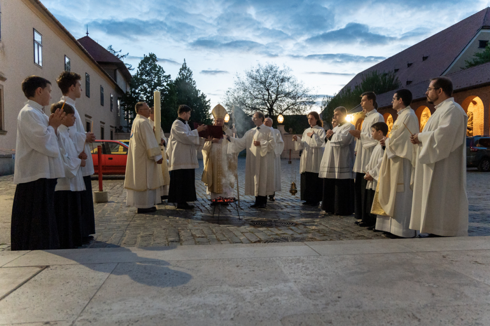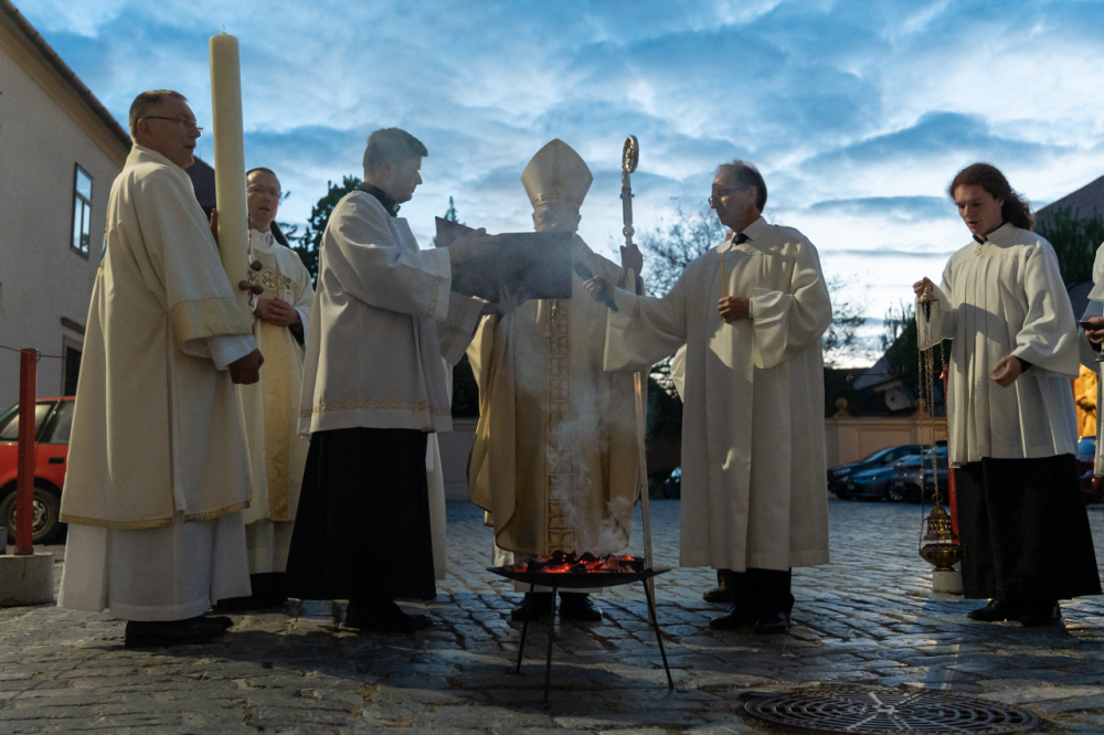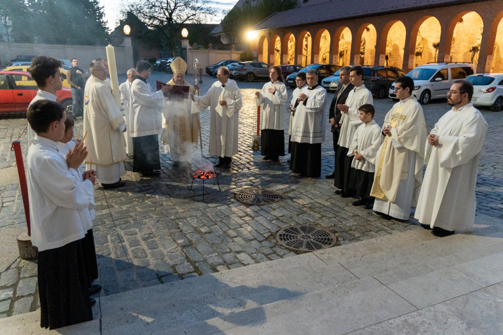 A szimbólumokban rendkívül gazdag szentmise kezdetén a sötétbe burkolózó templom előtti téren Felföldi László püspök a tűzszentelés szertartásában megáldotta a tüzet, melyről meggyújtották a Jézus élettelen testét szimbolizáló húsvéti gyertyát, hogy annak fellobbanó lángja új utat mutasson a világ sötétségének.