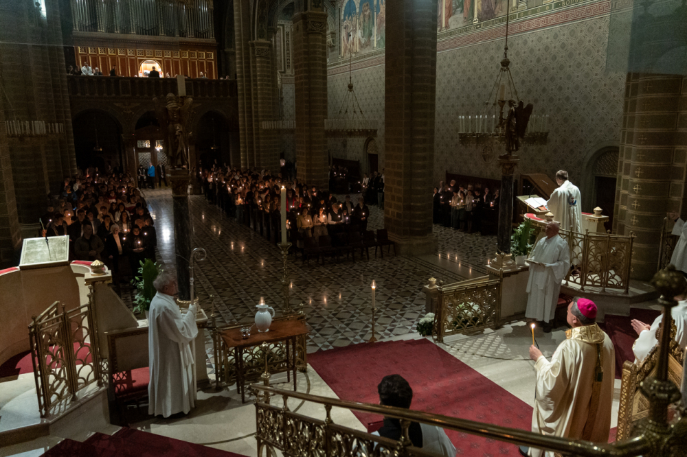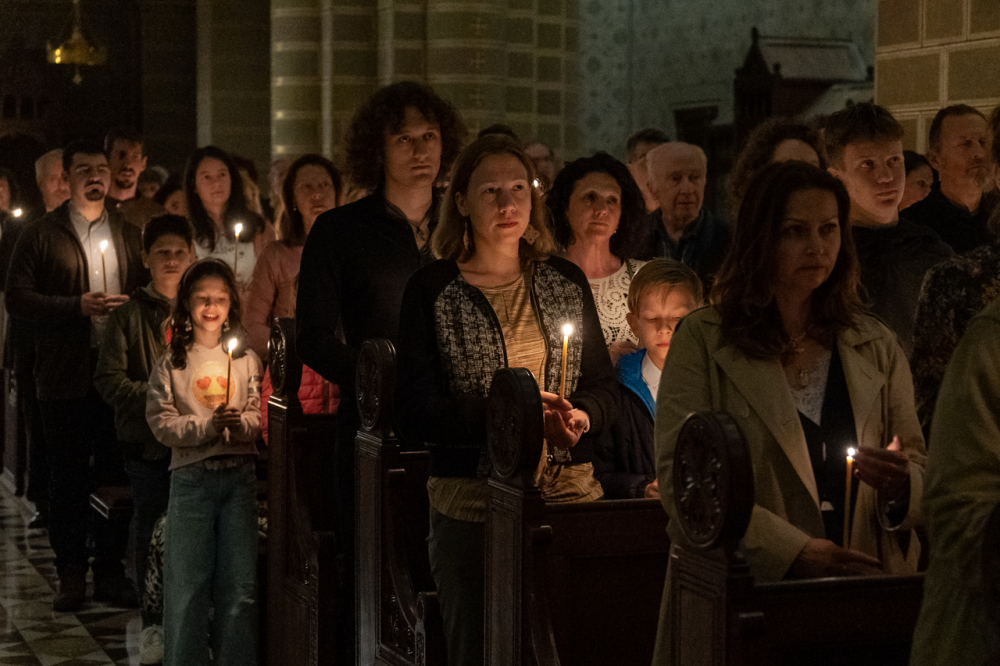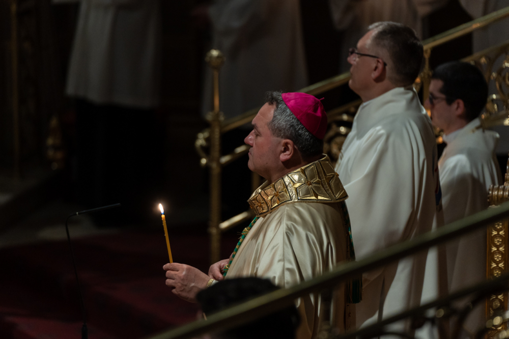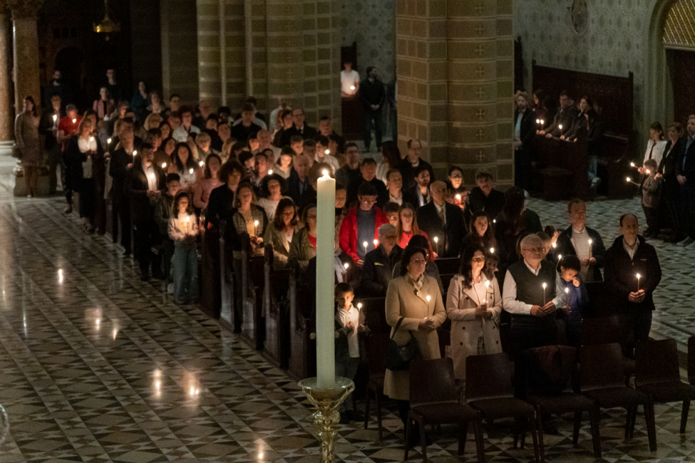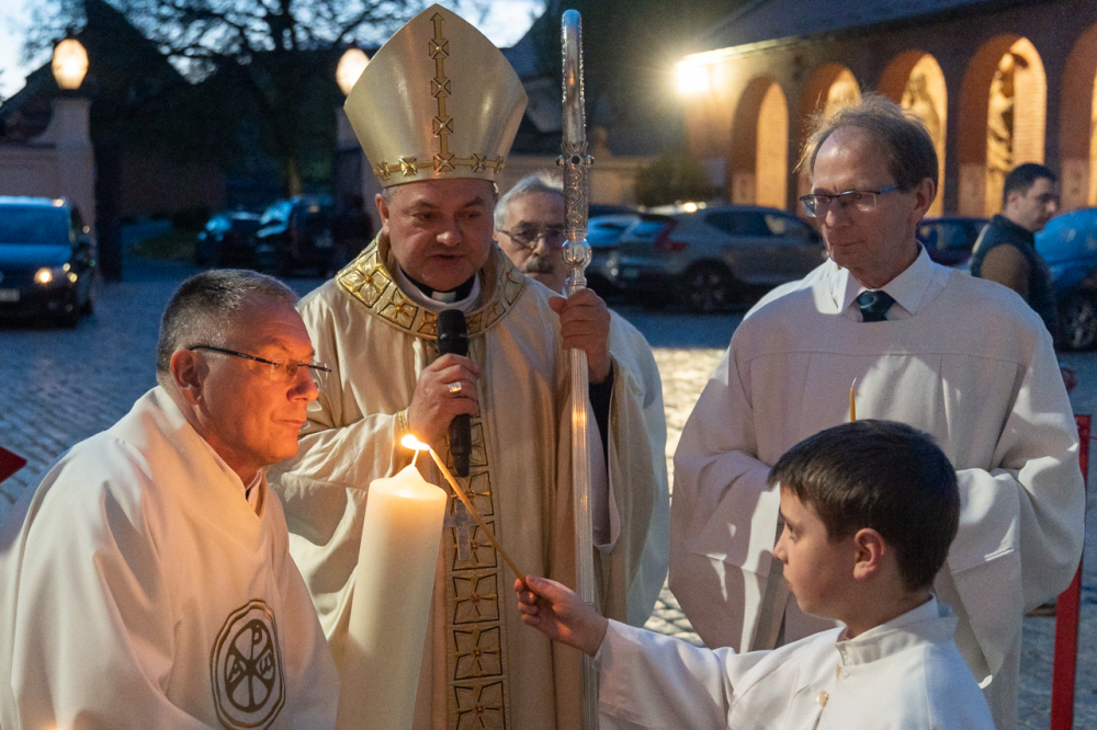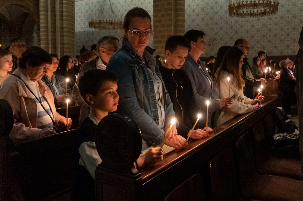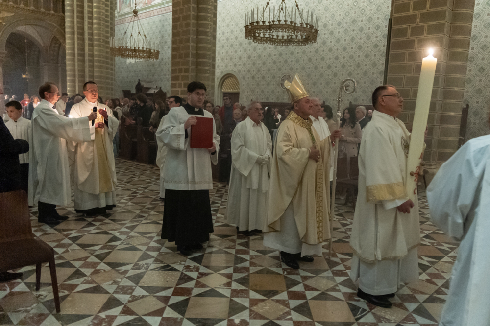 A főpásztor és asszisztenciája csendben vonult be a templomba húsvéti gyertyával, melynek lángját a hívek egymásnak adták tovább, a fellobbanó gyertyaláng fénye pedig lassanként betöltötte a székesegyházat, szimbolizálva Jézus dicsőséges feltámadását.