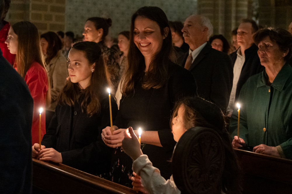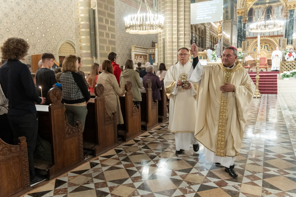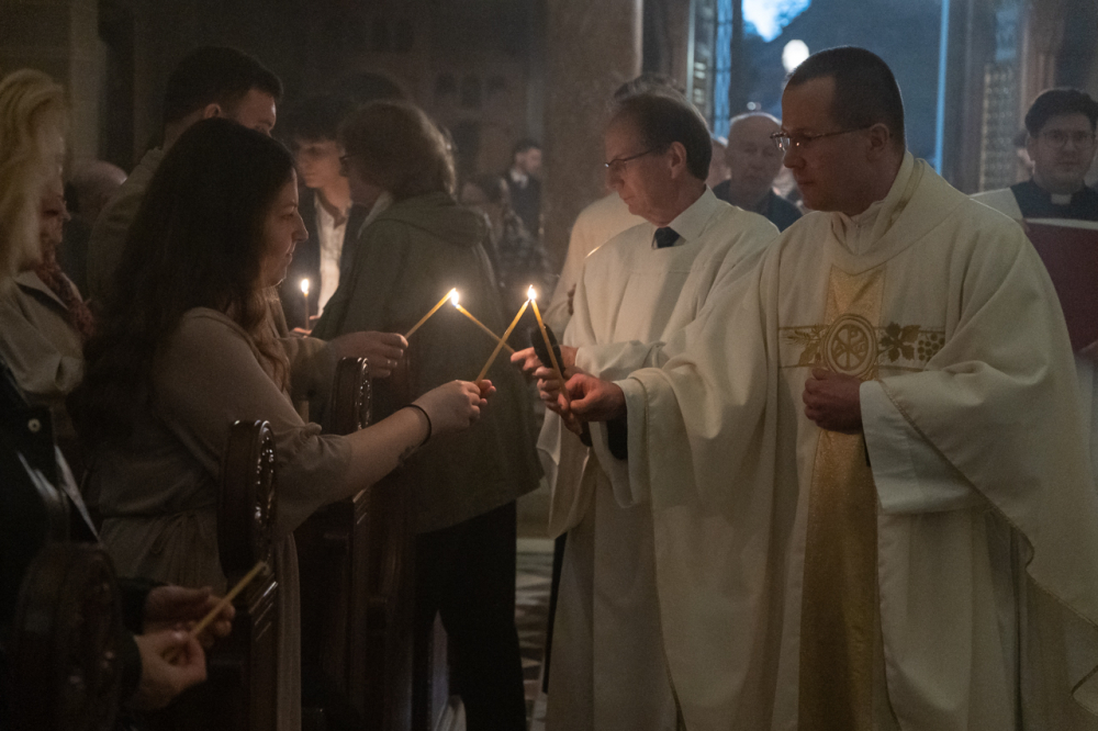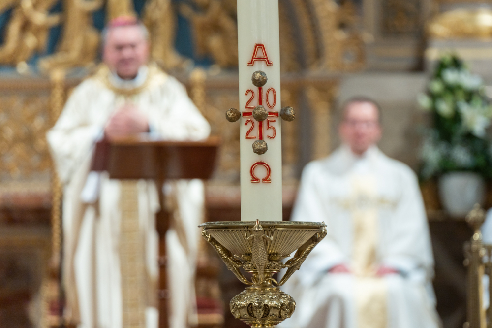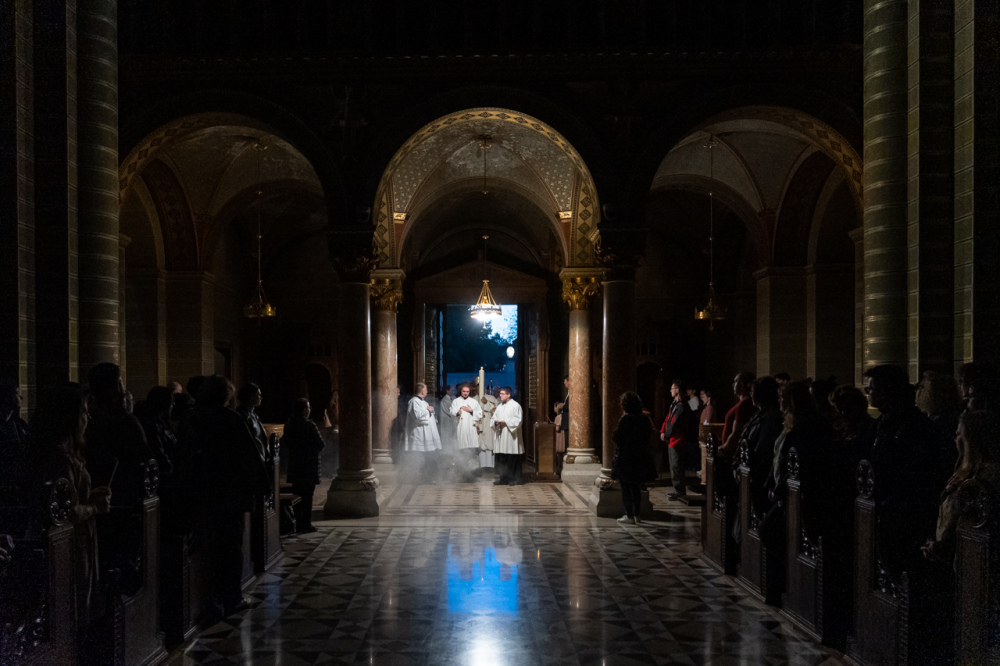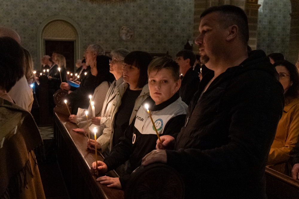 A főpásztor és asszisztenciája csendben vonult be a templomba húsvéti gyertyával, melynek lángját a hívek egymásnak adták tovább, a fellobbanó gyertyaláng fénye pedig lassanként betöltötte a székesegyházat, szimbolizálva Jézus dicsőséges feltámadását.