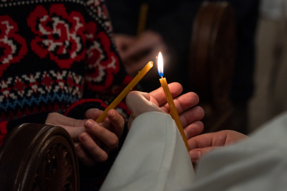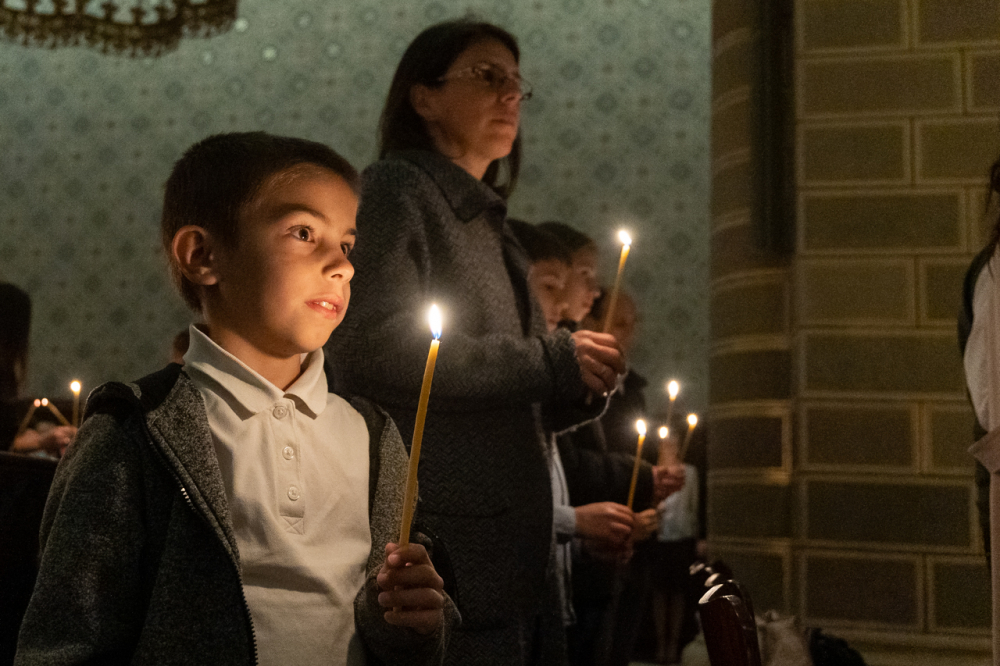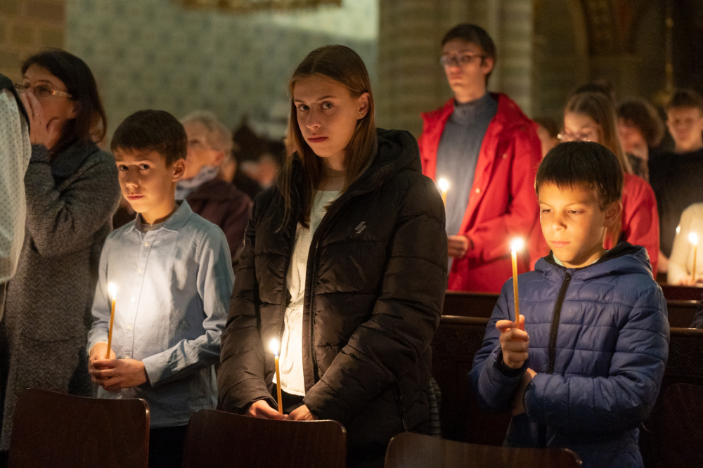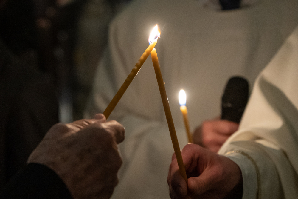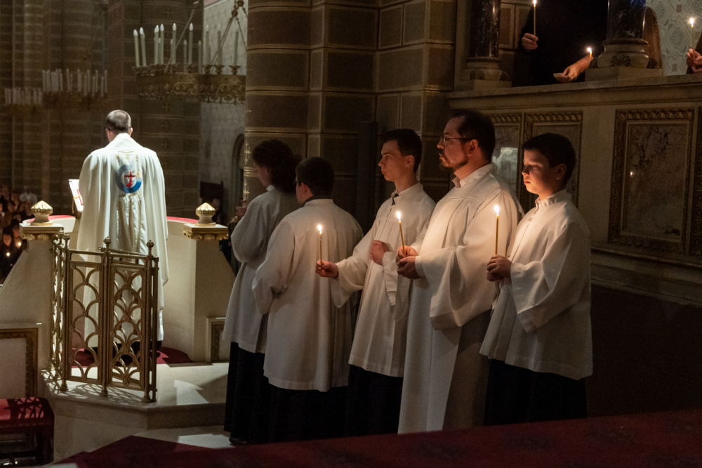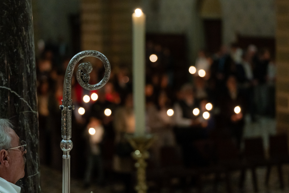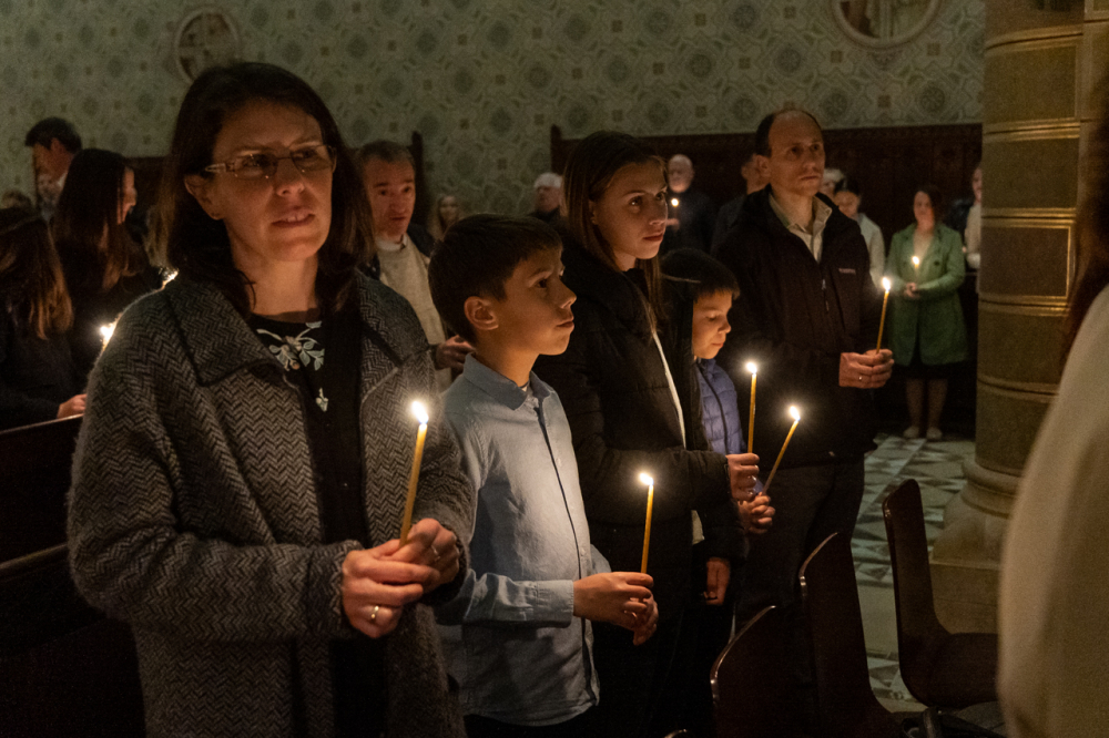 A főpásztor és asszisztenciája csendben vonult be a templomba húsvéti gyertyával, melynek lángját a hívek egymásnak adták tovább, a fellobbanó gyertyaláng fénye pedig lassanként betöltötte a székesegyházat, szimbolizálva Jézus dicsőséges feltámadását.