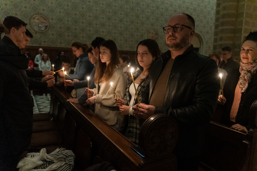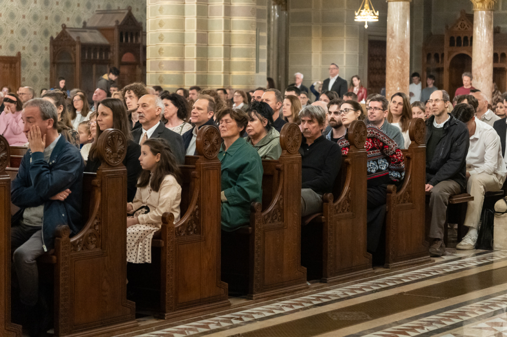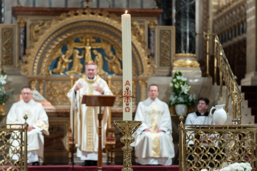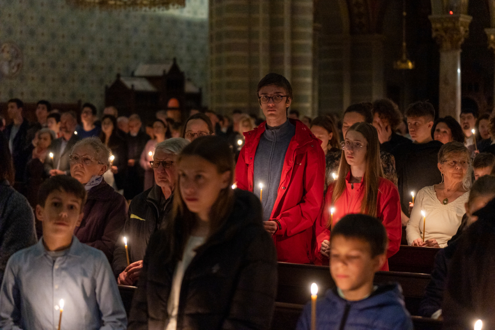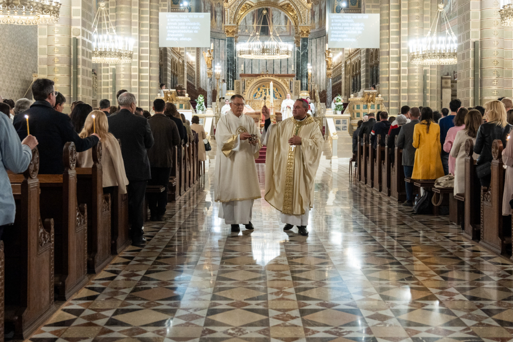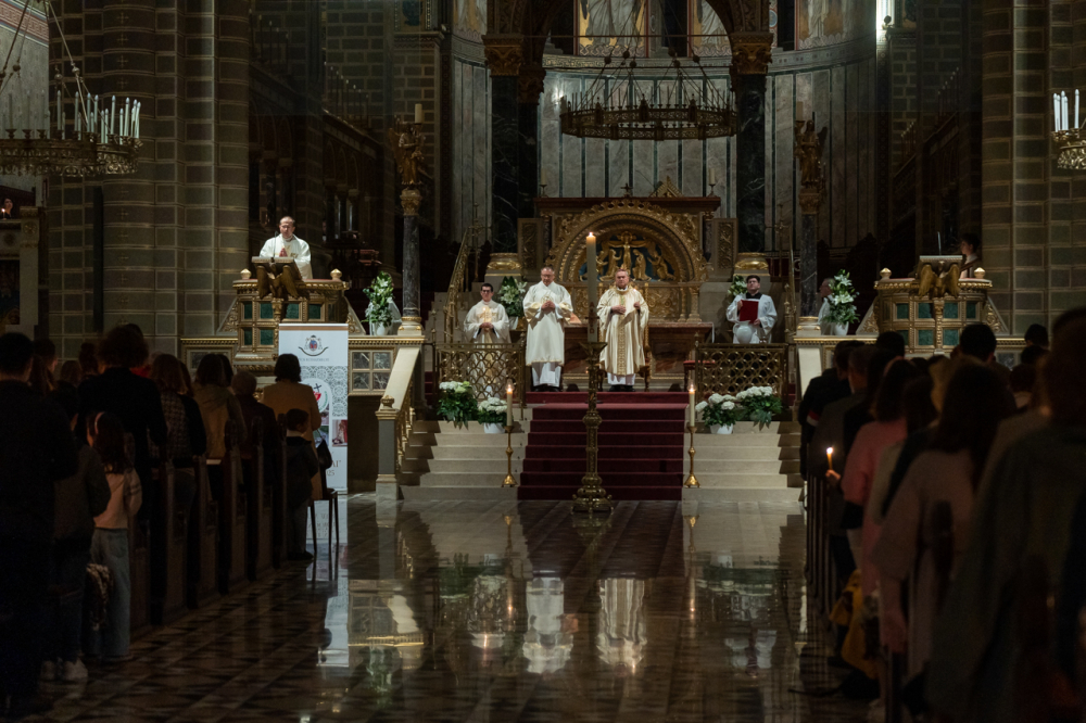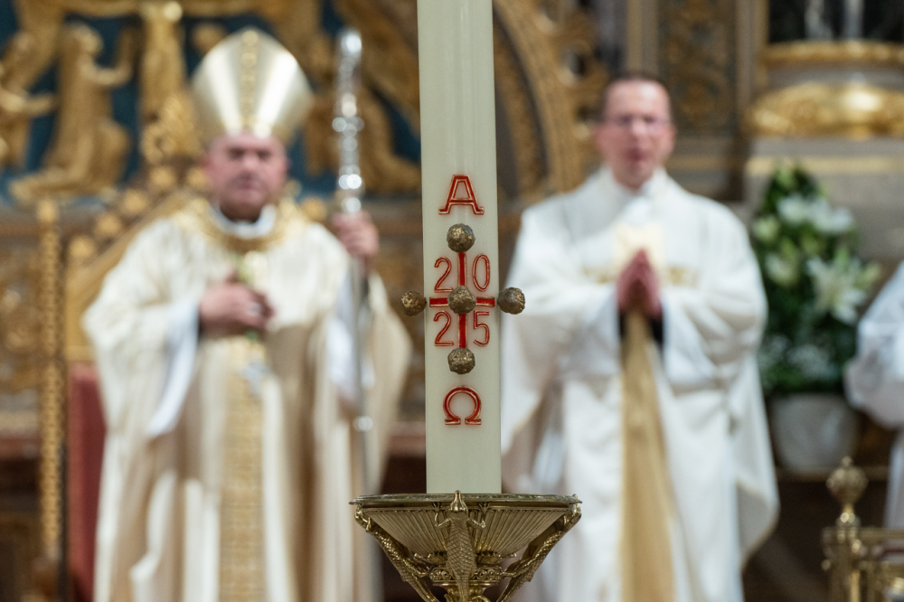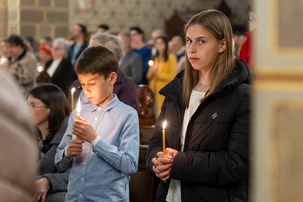 Majd pedig a liturgiában felcsendült az Exultet gyönyörű éneke Máger Róbert püspöki irodaigazgató tolmácsolásában, mely a húsvéti öröm kiáradását közvetítve sorolja fel az életünket átalakító kegyelmeket, melyek a húsvéti éjszakán fakadtak.