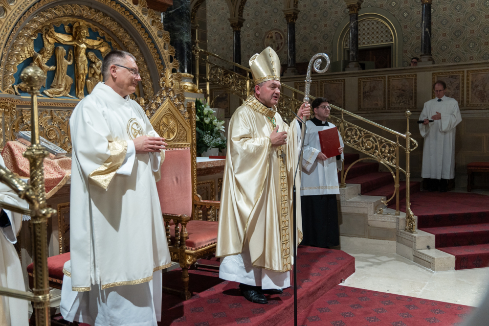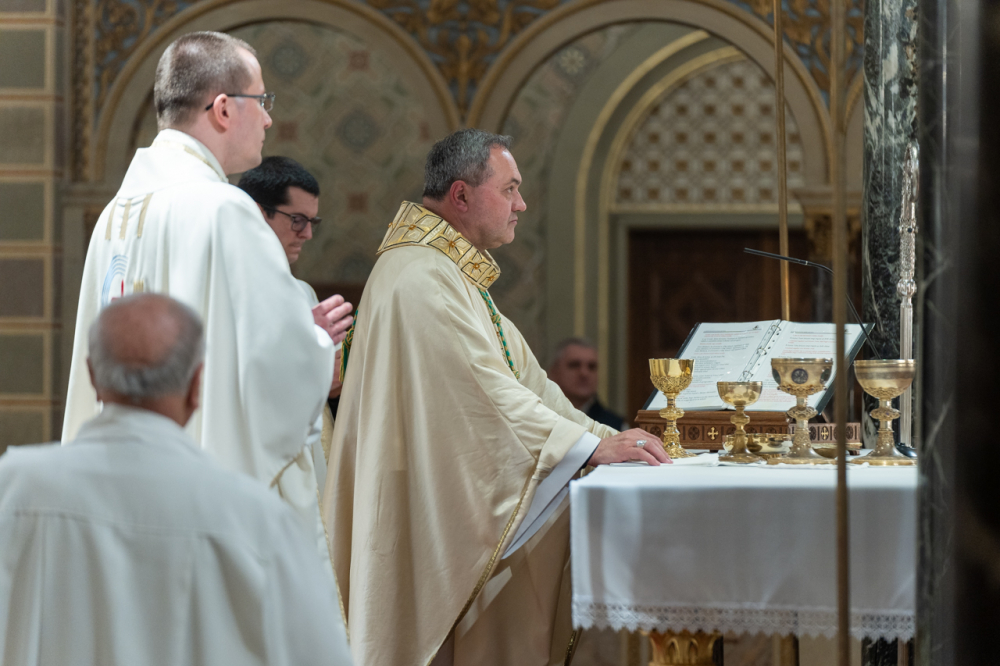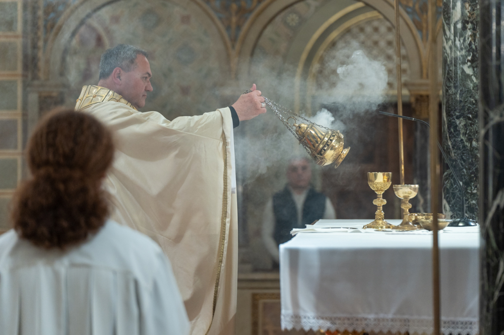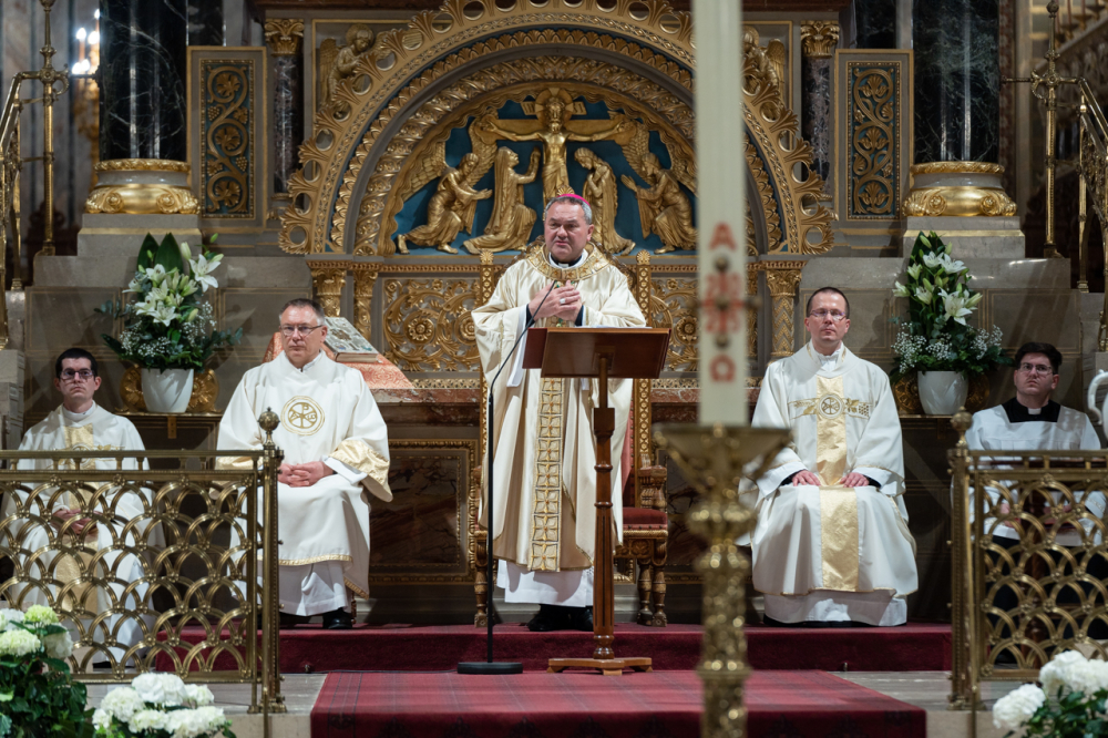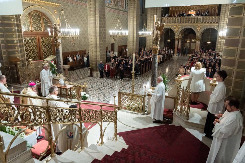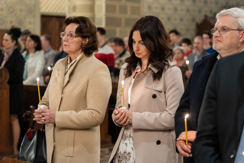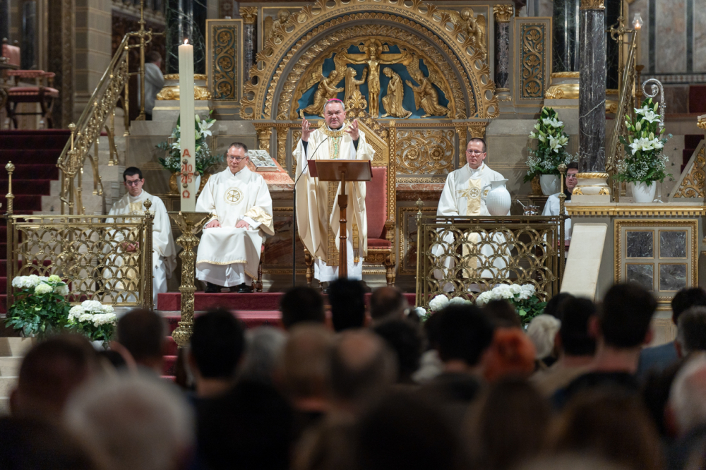 Majd pedig a liturgiában felcsendült az Exultet gyönyörű éneke Máger Róbert püspöki irodaigazgató tolmácsolásában, mely a húsvéti öröm kiáradását közvetítve sorolja fel az életünket átalakító kegyelmeket, melyek a húsvéti éjszakán fakadtak.