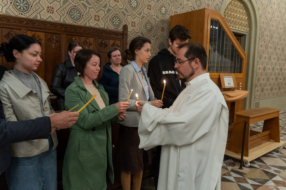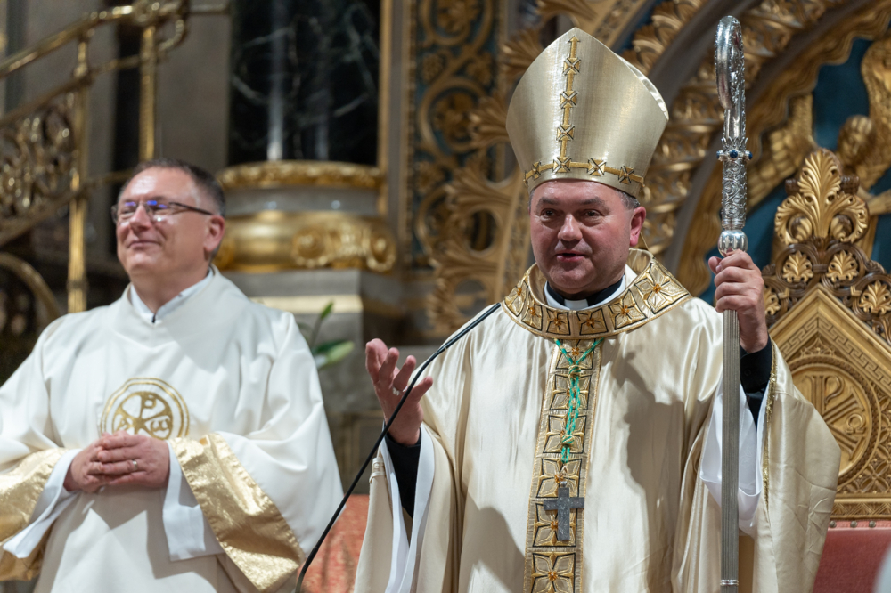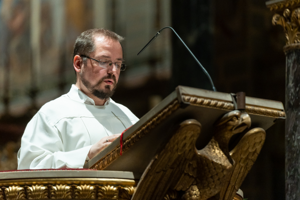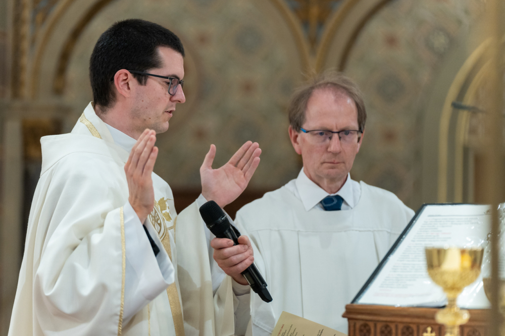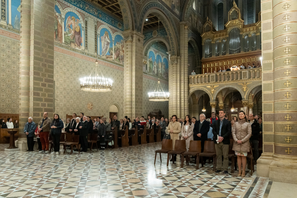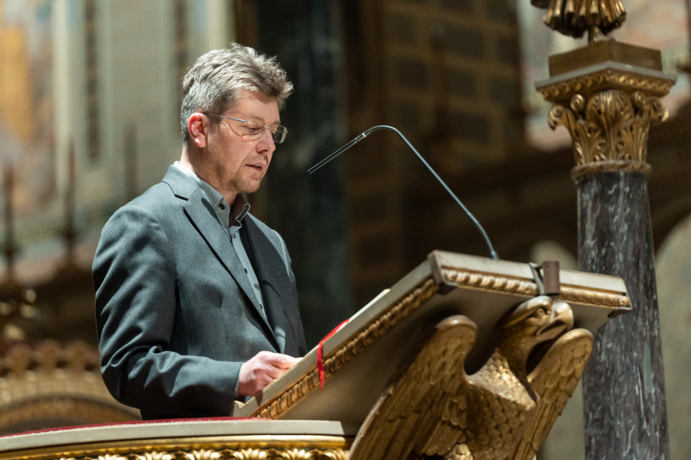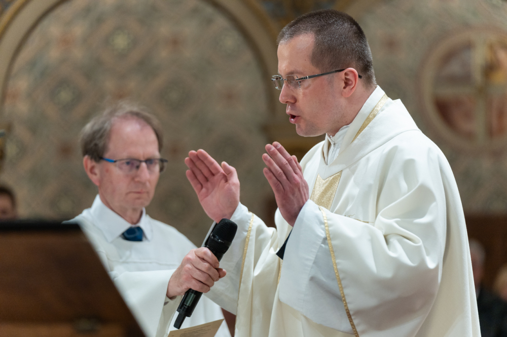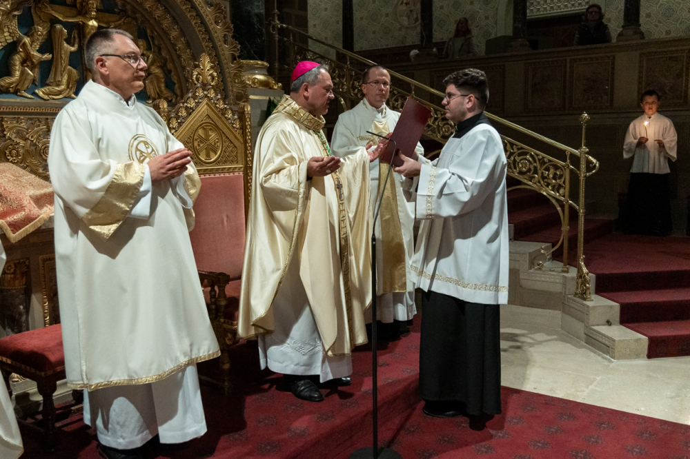 Majd pedig a liturgiában felcsendült az Exultet gyönyörű éneke Máger Róbert püspöki irodaigazgató tolmácsolásában, mely a húsvéti öröm kiáradását közvetítve sorolja fel az életünket átalakító kegyelmeket, melyek a húsvéti éjszakán fakadtak.