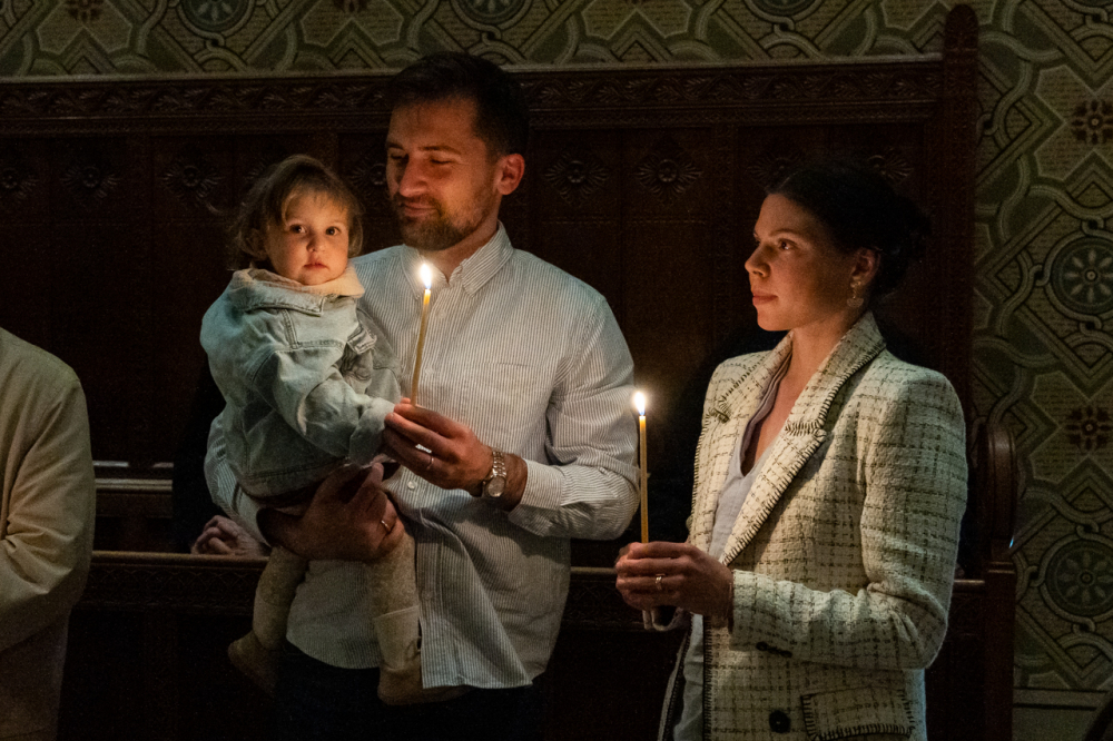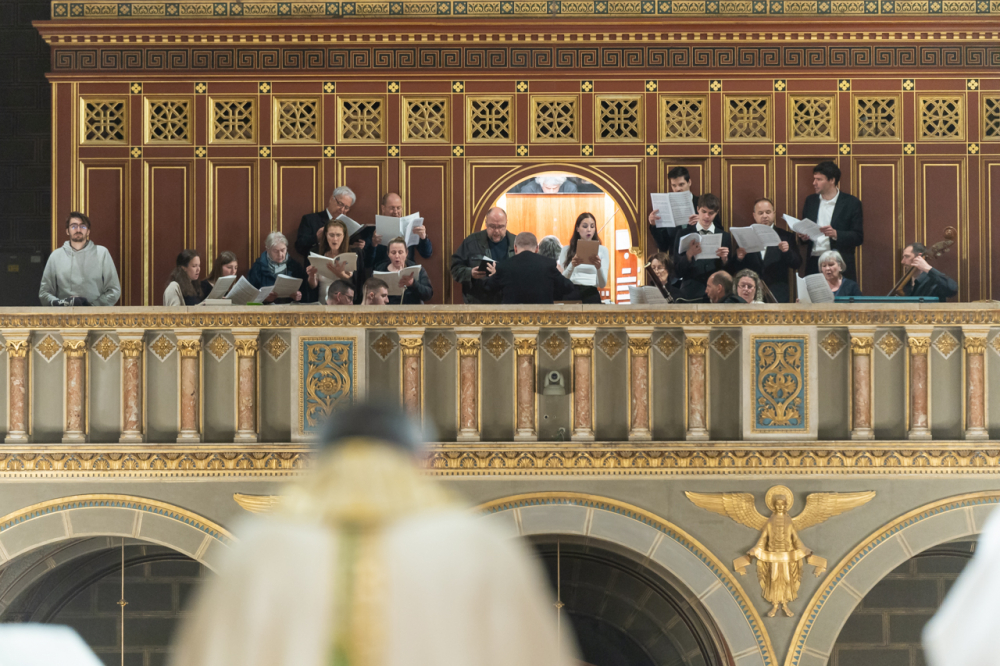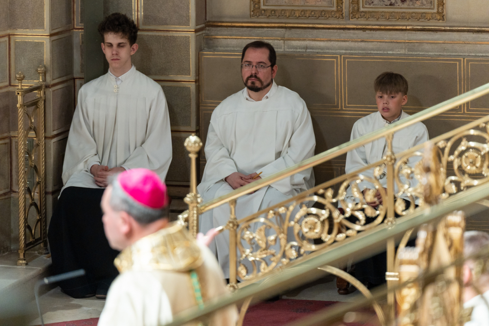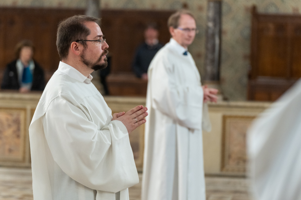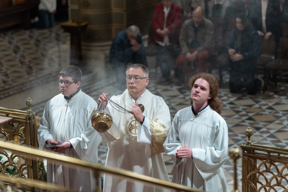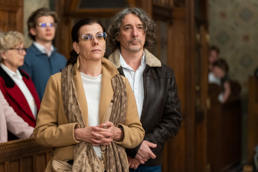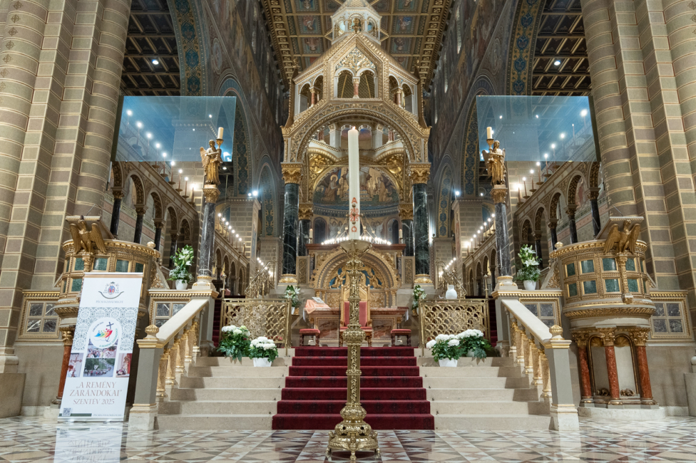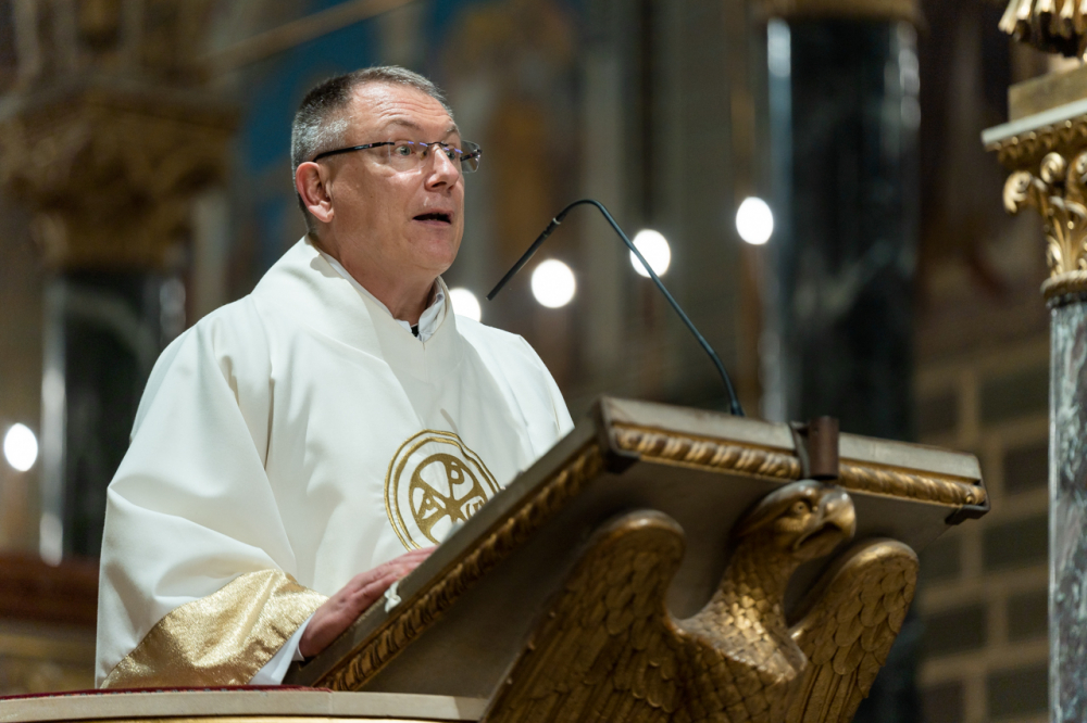 Majd pedig a liturgiában felcsendült az Exultet gyönyörű éneke Máger Róbert püspöki irodaigazgató tolmácsolásában, mely a húsvéti öröm kiáradását közvetítve sorolja fel az életünket átalakító kegyelmeket, melyek a húsvéti éjszakán fakadtak.