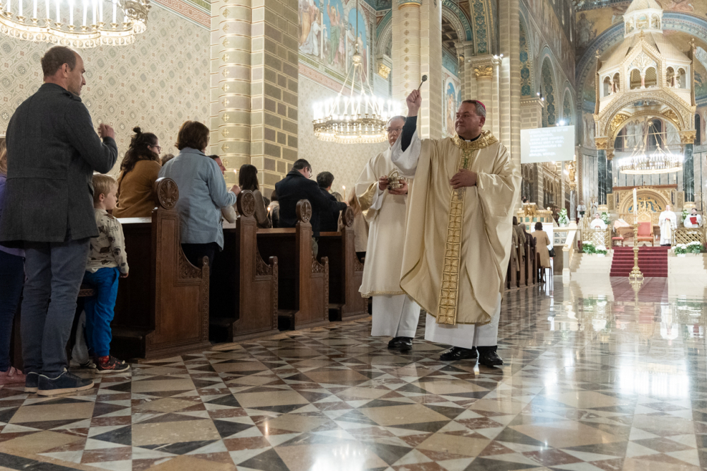 Ezt követően a főpásztor megáldotta a vizet, majd meghintette vele a híveket, akik kezükben a húsvéti gyertyával, megújították keresztségi ígéretüket. A húsvéti vigília zárásában a püspök köszönetet mondott az egyházmegye papságának és minden szolgálattevőnek a nagyböjti előkészületben való közreműködésért, majd áldott ünnepet, csöndet, fényt és világosságot kívánt mindnyájunknak, hogy valóban öröm, szeretet és béke legyen mindenki szívében.