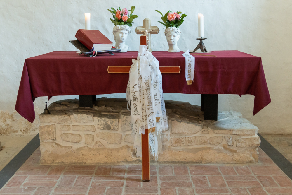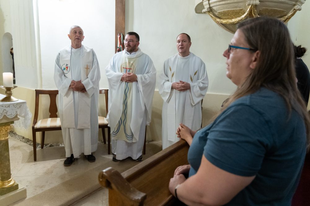 Püspökszentlászlón a zarándokmisét Mihovics Szebasztián újmisés mohácsi káplán celebrálta, akit éppen egy évvel ezelőtt, 2024. június 22-én szentelt pappá Felföldi László pécsi megyéspüspök. A papi hivatásokért felajánlott liturgián koncelebrált a jelenlévő papság, akik nevei szintén olvashatók a zarándokkereszt szalagjain.