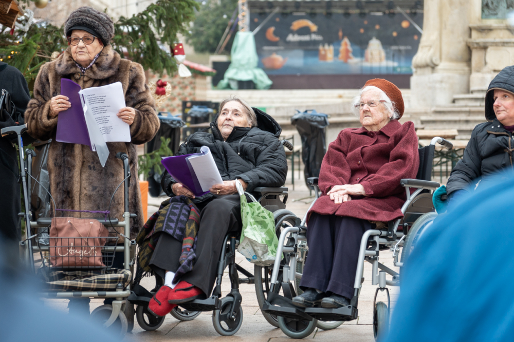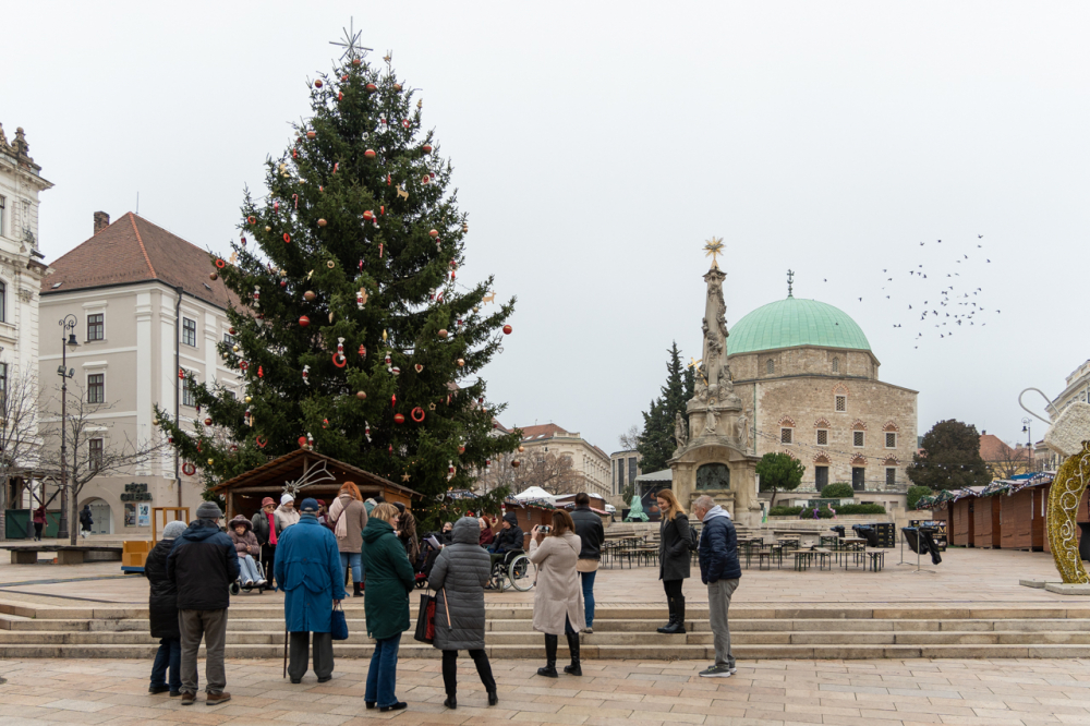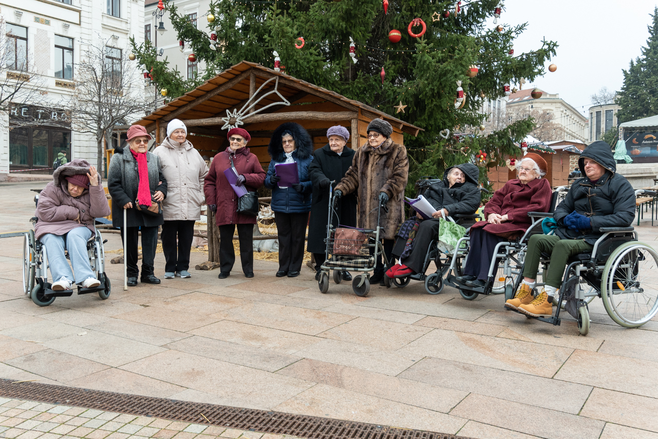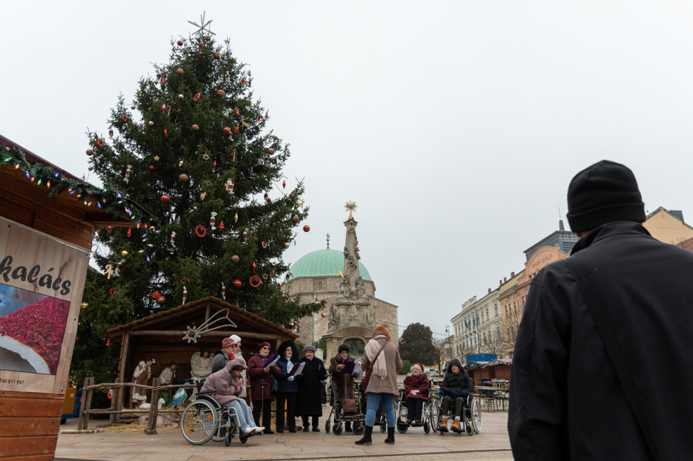 A Pécsi Egyházmegye fenntartásában működő Szent Lőrinc Gondozóotthon lakóinak kórusa énekelt Pécsen, a Széchenyi téren felállított karácsonyfa és betlehem mellett december 3-án.