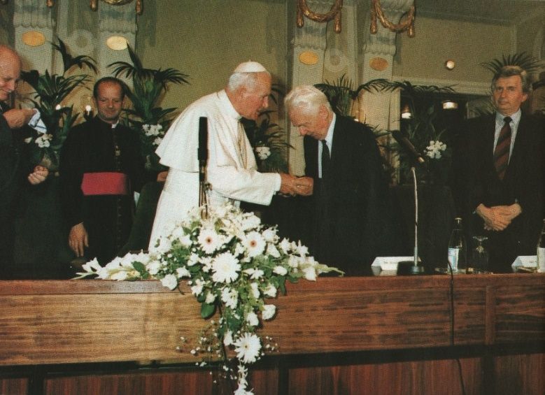II. János Pál pápa és Göncz Árpád a budapesti repülőtéren 1991. augusztus 16-án (MTI Fotó: Soós Lajos)8