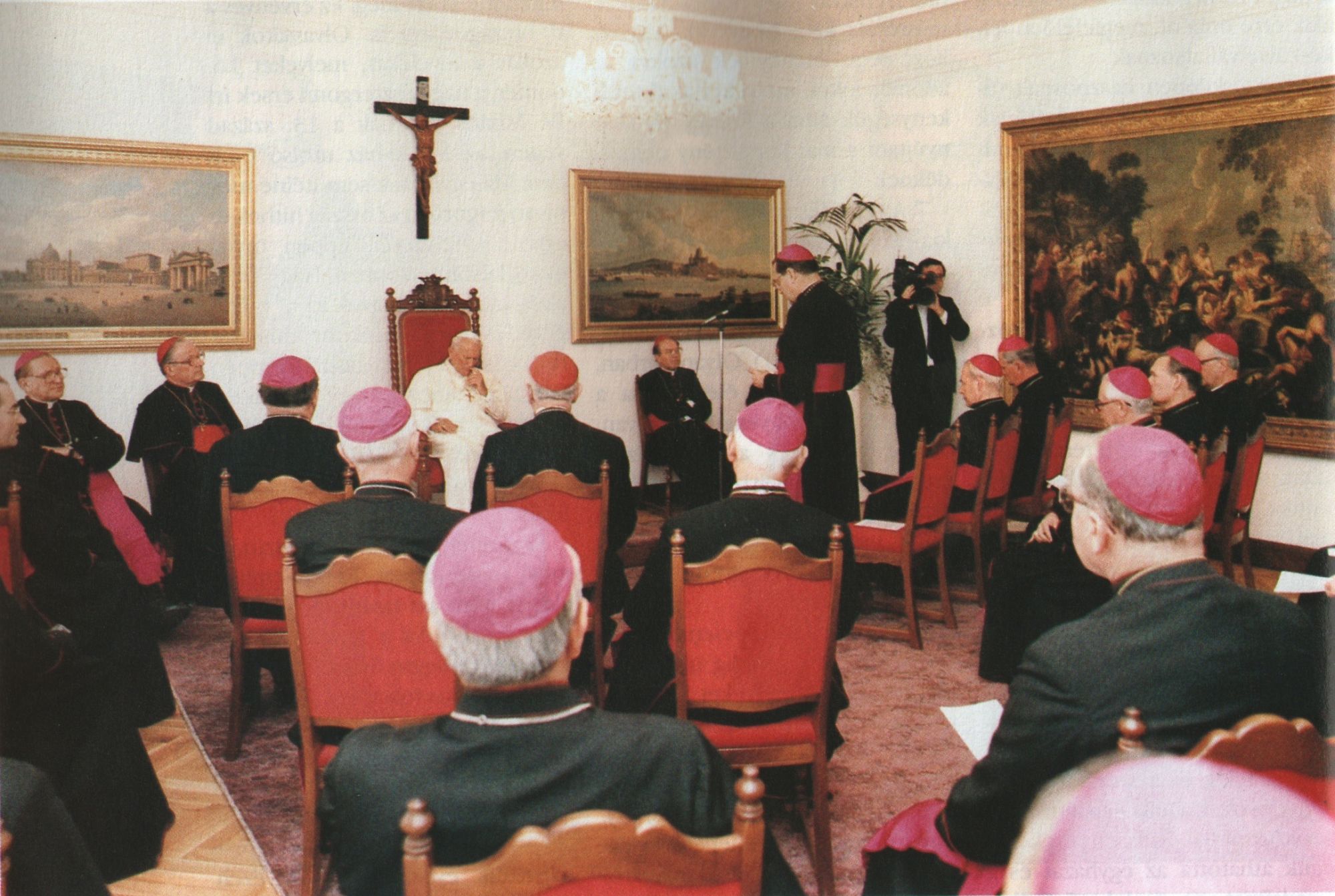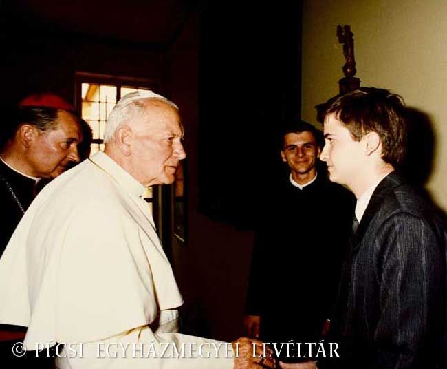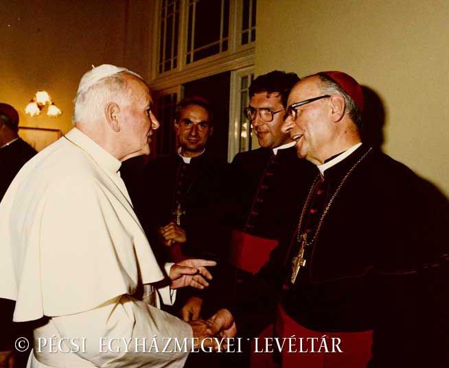 II. János Pál pápa a pécsi püspöki palotában Mayer Mihály és Cserháti József megyéspüspökökkel39