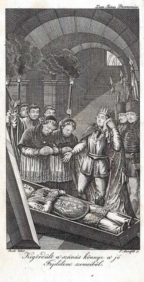 A Mátyás király elleni összeesküvésben való részvétele miatt az 1472. március 27-én, Medvevárban bekövetkezett halálakor a Zágráb melletti Remetineci pálos kolostorban helyezték első alkalommal nyugalomra. 1472 vagy 1473 folyamán a pécsi Székesegyház, altemplomába vitték holttestét, ahol ismét eltemették. A sorban elsőként szereplő forrás több szálon is kötődik Pécs városához. A baranyai Kölesy Vince Károly és Melczer Jakab a Nemzeti Plutarkus első kötetének egy III. János pécsi püspököt ábrázoló illusztrációját a 19. század elején készítette el Buck József pécsi rajztanár rajza alapján Johann Georg Mansfeld bécsi rézmetsző. A képaláírás szerint: „Kigördült a szánás könnye a jó Fejdelem szemeiből.” A metszet azt a pillanatot mutatja be, amikor a Pécsre látogató Mátyás királynak a papok megmutatták Janus Pannonius pécsi altemplomban rejtegetett, temetetlen holttestét.