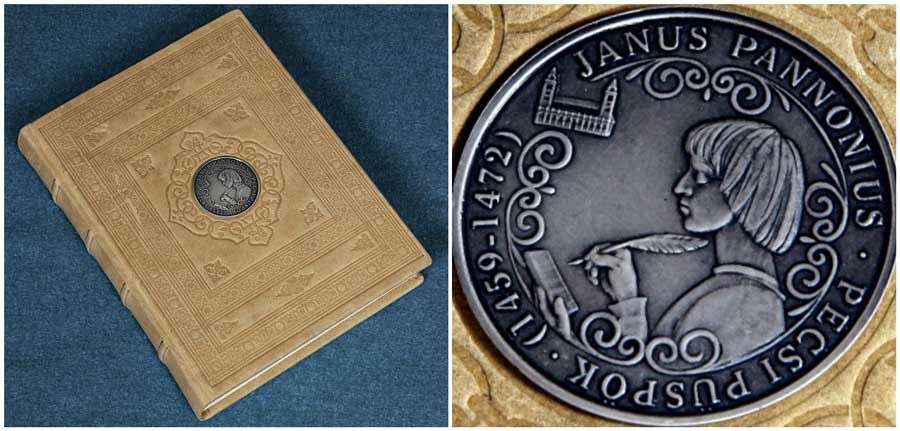 A 2008-as Janus Pannonius fakszimile és a díszítő emlékérem másolata a kötet első kötéstábláján