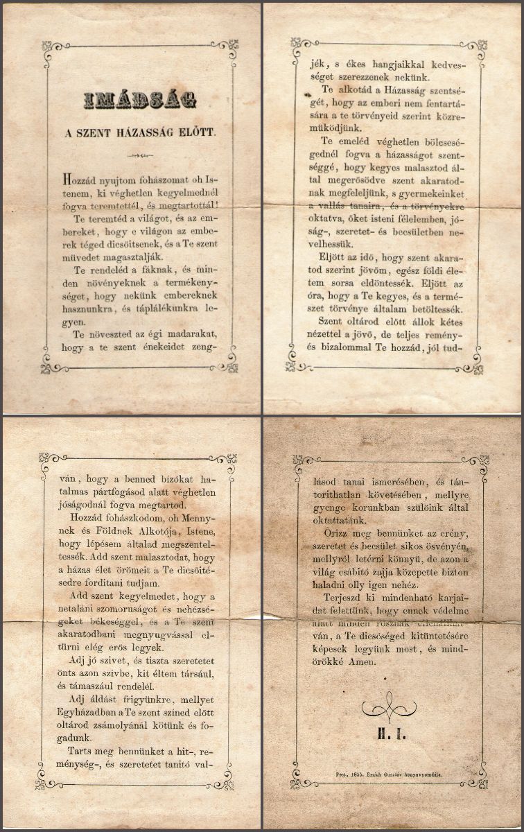 Imádság a szent házasság előtt. Pest, Emich Gusztáv könyvnyomdája, 1855. [4 p.]