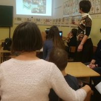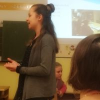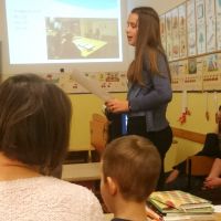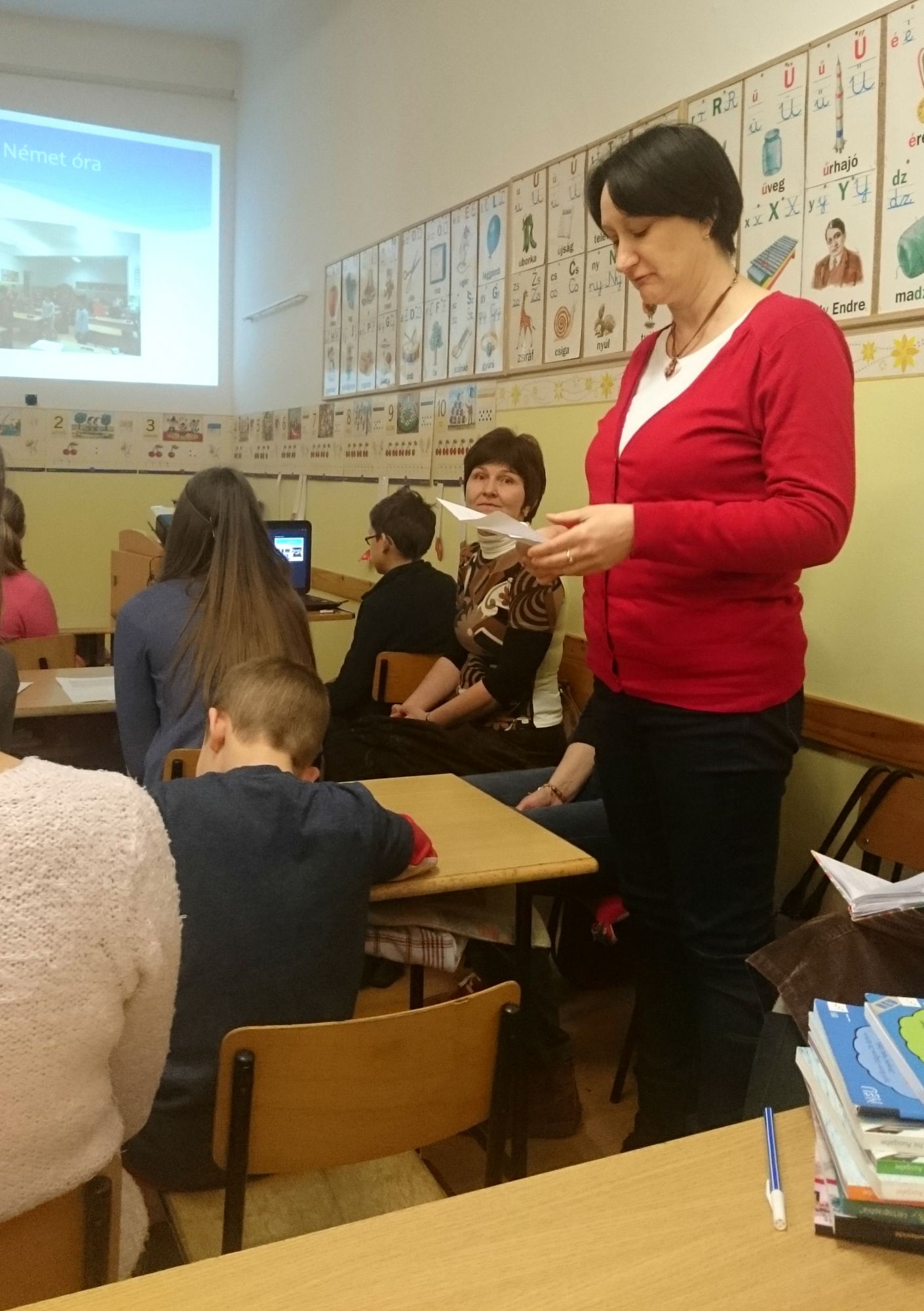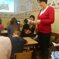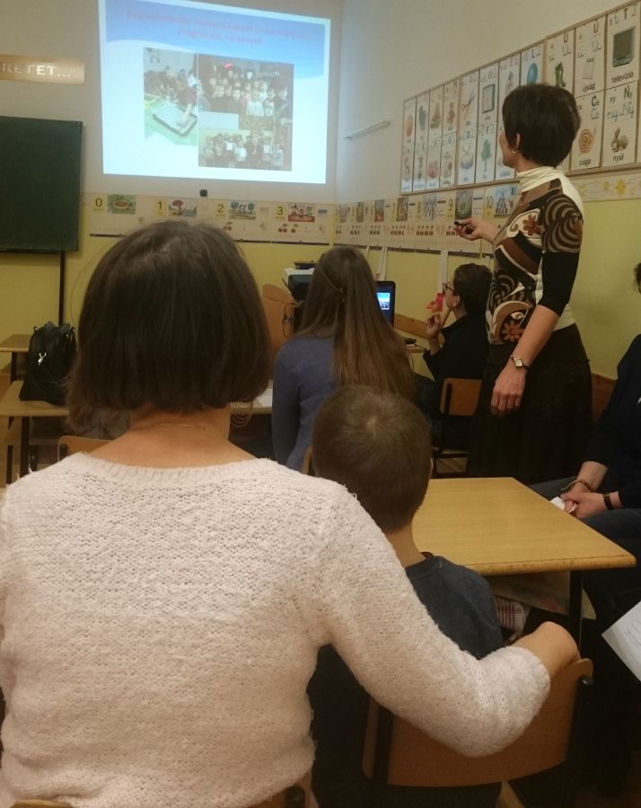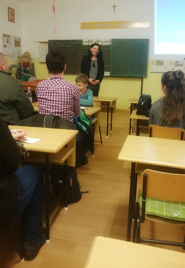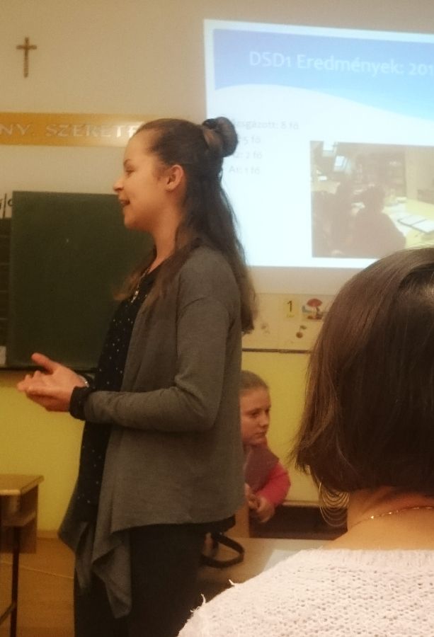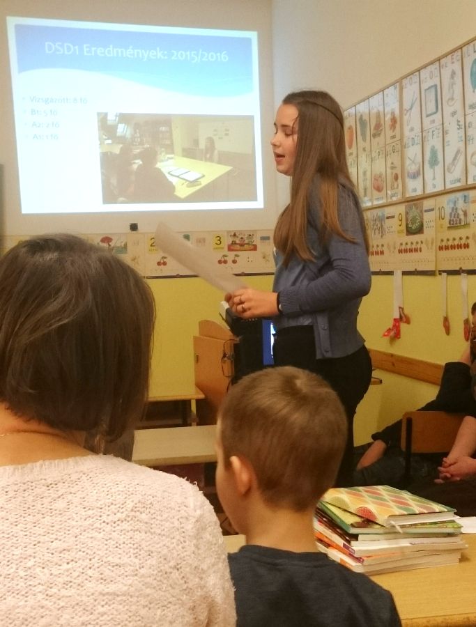 A német munkaközösségi tagok előadásának középpontjában a játékos, tevékeny nyelvtanulás állt. Az iskolai életből kiragadott eseményeken keresztül (projektnap, tájház látogatása, német vers –és prózamondó verseny) ismertették a nyelvtanulás hasznosságát. Kihangsúlyozták, hogy a kicsik körjátékok, énekek, táncok segítségével alapozzák meg szókincsüket és ismereteiket, amit a felső tagozaton tovább mélyítenek, így 8. osztályban DSD vizsgát tudnak tenni. Az iskola az idei évtől kezdve hivatalos nyelvvizsga központtá vált.