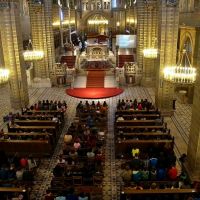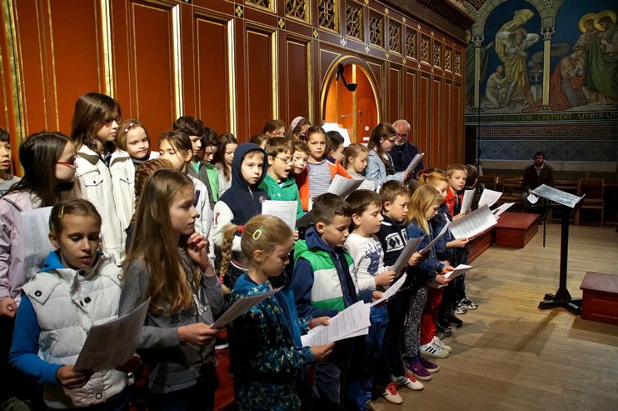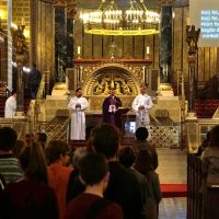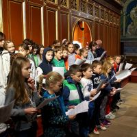DSC09786 001A szentmisén – rendhagyó módon – egyszerre három kórus is szolgált: a kicsinyek kórusa, az 5-6. évfolyam scholája és a vegyeskar. A jövő héten megrendezésre kerülő Musica Sacra Egyházzenei Verseny énekei mellett az Éneklő Egyház kötet kincseit jelentő Introitus, Responzórium, Traktus, Communio, az ordináriumok és verses népénekek is elhangzottak.