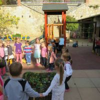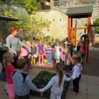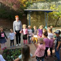 A gyermekek homokozó lapátokkal segítettek ültetőgödröket ásni, a megújult virágoskertet az óvoda többi csoportja is megcsodálta, énekkel és imával köszöntötte.