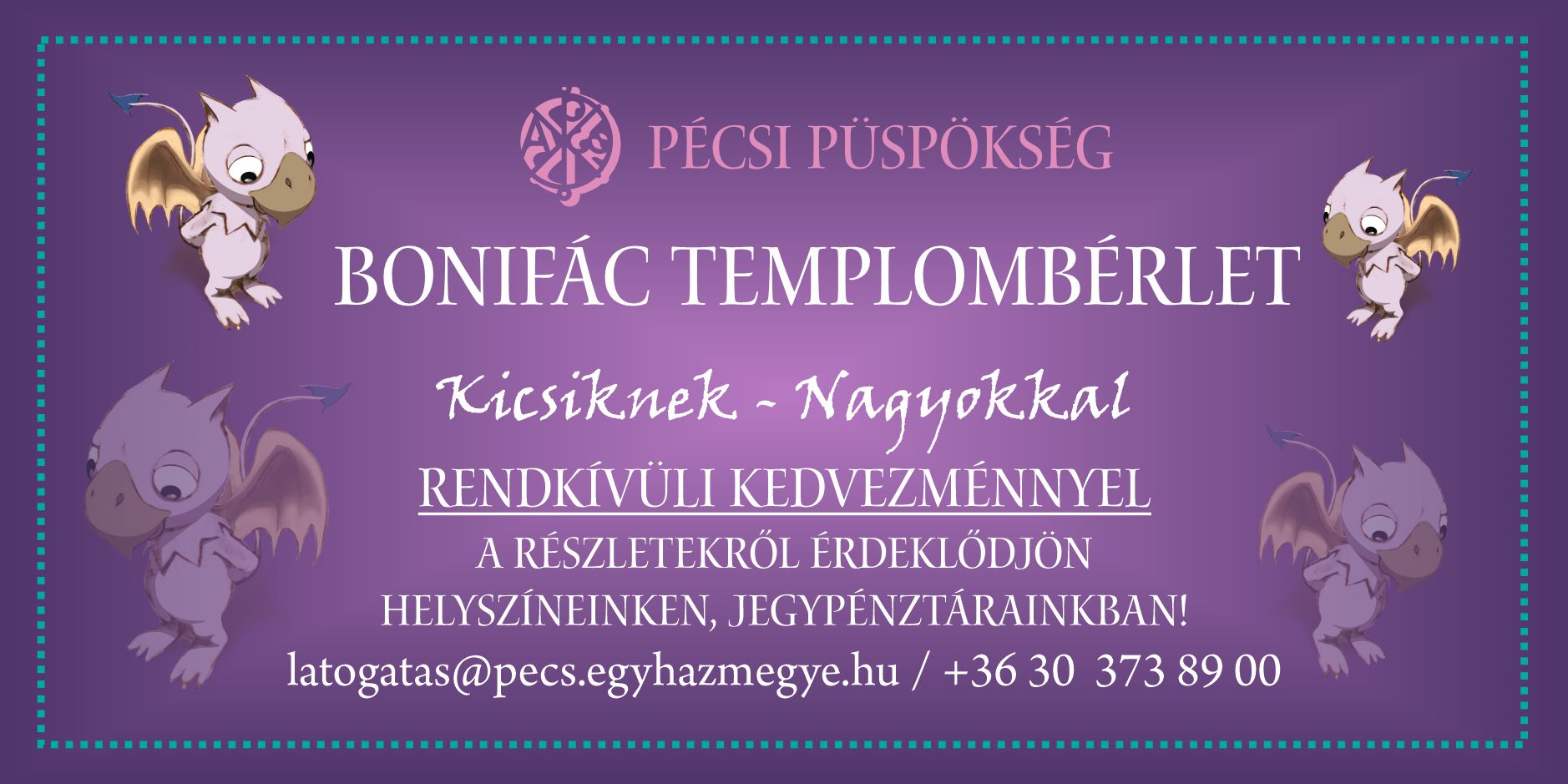 A Pécsi Püspökség újonnan kínált templombérletével a családoknak szeretne támogatást nyújtani abban,hogy Pécs belvárosának legszebb templomai és ékkövei ne csak a képeslapokról legyenek ismerősek,hanem közel kerüljenek a legkisebbek szívéheza mindennapi sétáik során is. A Pécsi Püspökség Templombérlete felhasználható egy vagy két templomba, 1 felnőtt és 6 éven aluli gyermekei részére. Érvényességi ideje fél év.