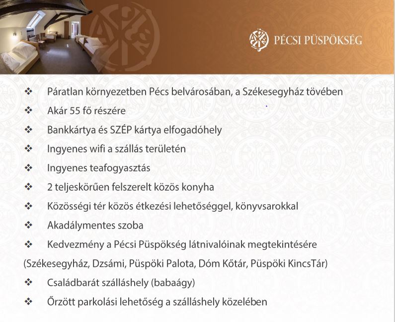 Pécs történelmi belvárosának szívében helyezkedik el a székesegyház, a Dóm kőtár valamint a KincsTár közvetlen közelében. A gépkocsiforgalom elől elzárt, csendes, nyugodt környezet ideális a pihenni vágyóknak, családoknak, zarándokoknak. Néhány perces sétával elérhetők a város legjelentősebb vallási, kulturális helyszínei és múzeumai.